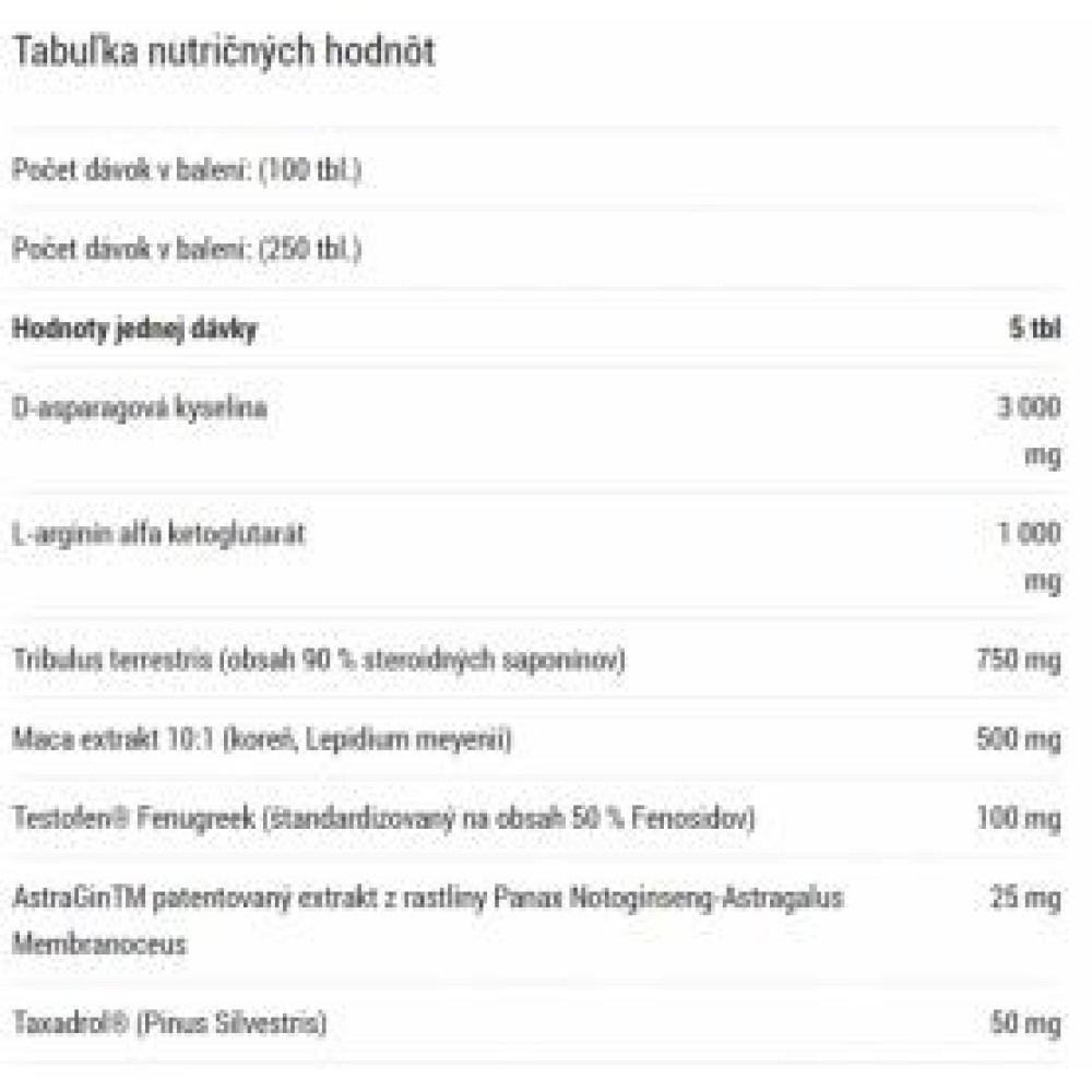 | Účinky | Zvýšenie hladiny testosterónu, zvýšenie svalovej sily, zlepšenie sexuálneho zdravia |